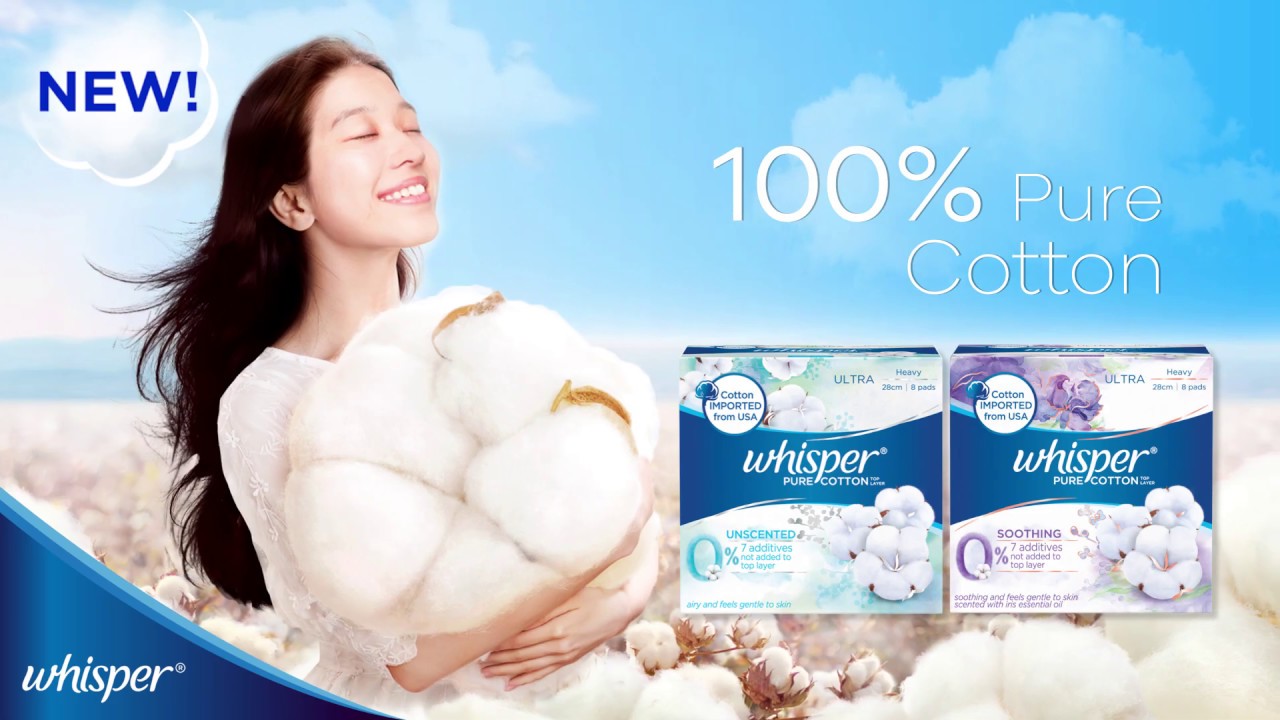 The new in town 'pure cotton' series is full of pureness and 0% of 7 additives (e.g. Johan tsai director of photography Whisper 護舒寶 pure skin系列日用衛生巾 2014 廣告 (30秒香港版) whisper pure skin系列 全新上市,擁有日本進口極柔棉感表層,超鎖水同去異味,讓妳『嗰幾日』都自信光彩滿分 官方. Whisper launches the new 'pure cotton' series with 100% pure cotton top layer!